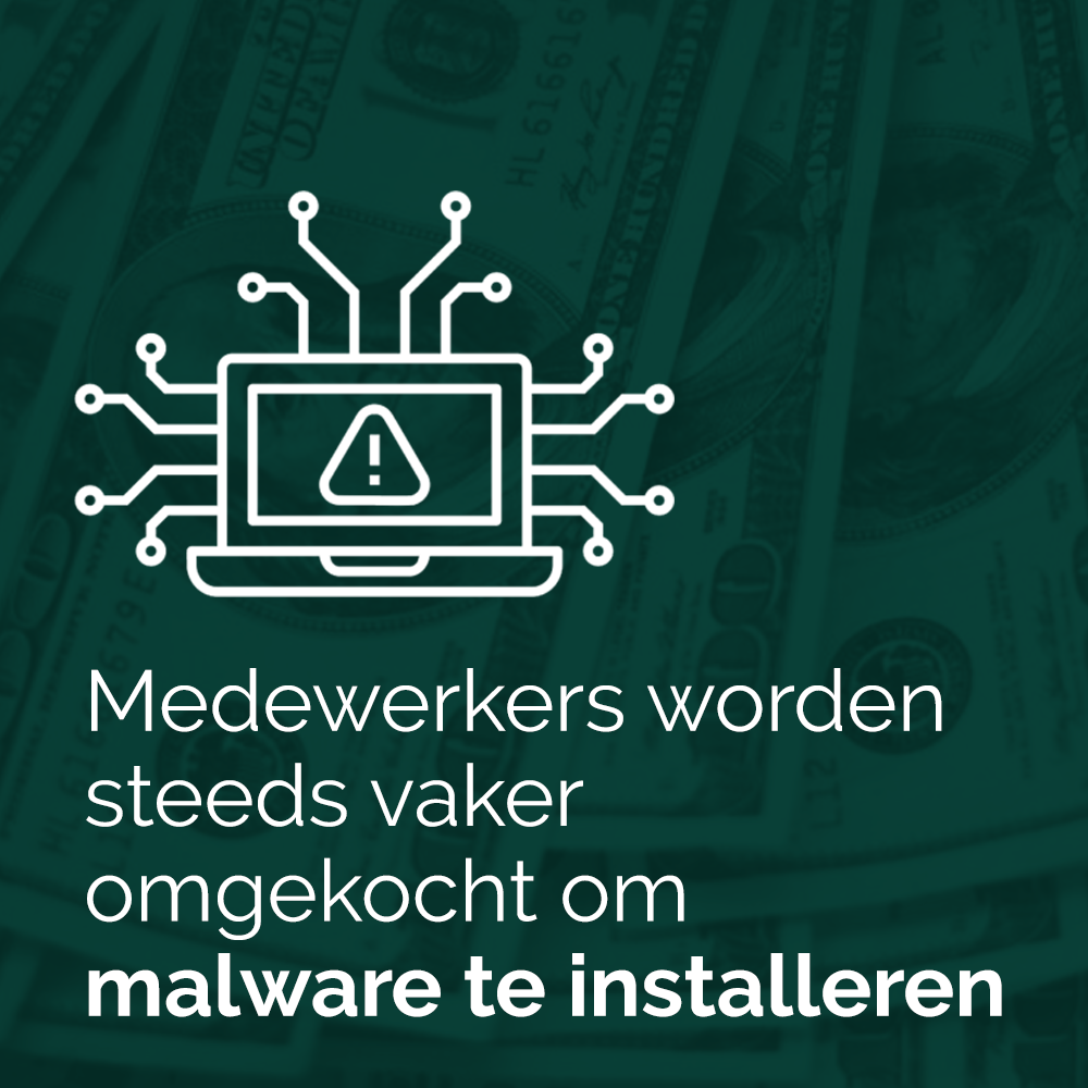 Steeds vaker worden medewerkers benaderd om malware op zijn of haar bedrijfs-pc te installeren. Zo is er onlangs geprobeerd een Tesla medewerker om te kopen. Deze nieuwe vorm van cybercriminaliteit vormt een groot risico voor bedrijfsnetwerken.
